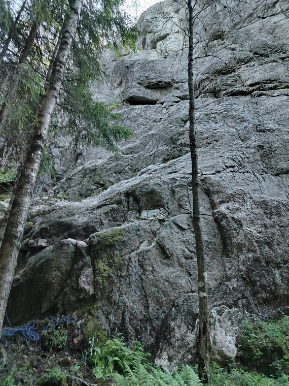 Alun hyllyjen jälkeen seikkailullista kiipeilyä vasemmalle kaartavassa sisänurkassa. Varmistaminen ei ole aivan helppoa mutta reitti on kiivettävissä turvallisesti. Klippiankkuri topissa. 24 m.