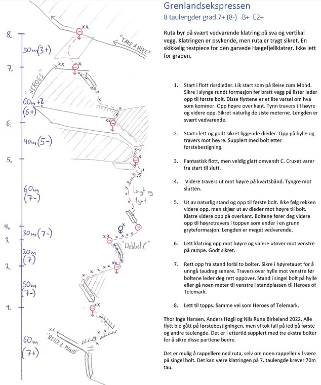 Very sustained, mentally demanding climbing on slabs and vertical walls. Well protected but not soft for the grade. A real test piece for seasoned Hægefjell climbers. Pitch 1 (60–70m, 7a+) starts up a corner crack (same as Reise zum Mond), steep crimpy wall to bolt, thin traverse right and up, finish on gear. Pitch 2 (50m, 6b+) climbs an easy leaning dihedral to a ledge, then traverses right with an added bolt. Pitch 3 (20m, 7a) takes on a slick reverse C-feature, crux from start to finish. Pitch 4 (30m, 6b+) traverses rightward on a quartz band, harder at the end. Pitch 5 (60–70m, 6c) climbs up to a bolt, cuts right from the dihedral, then bolts guide you up to a shallow bowl. Pitch 6 (40m, 5-) offers easy climbing up right then left on a ramp. Pitch 7 (60m, 6b) goes straight up past bolts, traverses left on a ledge, then straight up. Belay at a single bolt or Heroes belay. Pitch 8 (50m, 3+) is an easy scramble to the top.