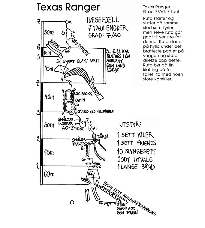 Mye baksing i starten. Veldig flotte bratte lengder på 2. og 4. lengde. Gikk FA på ny variant. rett opp svakt venstre fra standplass under 2. lengde gir bratt og fin klatring. Litt tynt sikret i starten. Spennende cruxflytt. Grad 7-