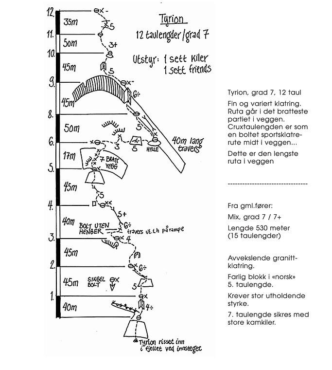 One of Hægefjell’s most classic routes. Climbs steep walls, a legendary traverse, and a striking dihedral visible from the parking lot. Varied climbing with slab, cracks, dihedral, and a sport crux. Crux is short and steep; other pitches are easier.
