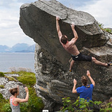 You get a remote feeling in this small crag that's pretty close to the city. It's a collection of blocks located on a small peninsula on the north-western seaside of Bratten north west of Bodø centre. Not much has been developed but you'll find a few nice lines to enjoy in the afternoon sun with views over the sea. If not for the bouldering it's well worth the trip for the special atmosphere there. More development is possible still.