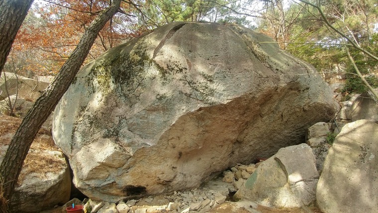 오버행 아래 언더 홀드를 왼손으로, 오른손은 흐르는 크림프를 잡고, 바닥에 있는 큰 송곳 바위에 올라타 점프 스타트 합니다.