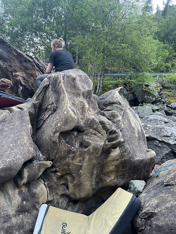 Follow the holes on the right hand side of the rock. Great left foot hold on the holes on the bottom left hand side.