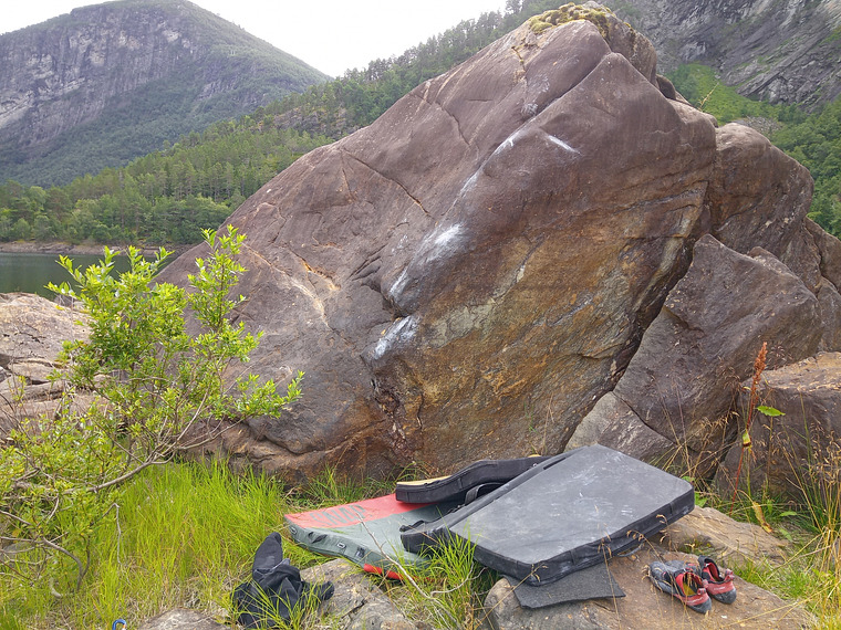 Sit start in sloper, continue along the arete. Mantle at the big jug on top.