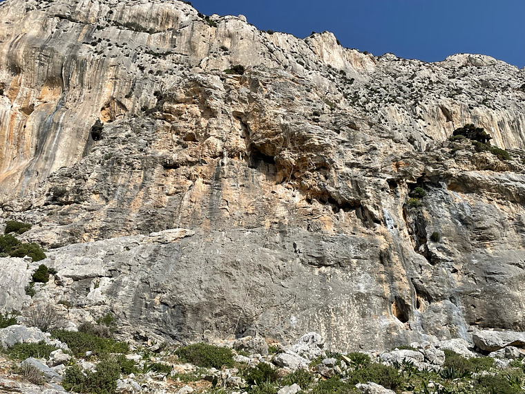 Wear helmets, potential rocks falling from routes above.
