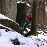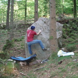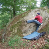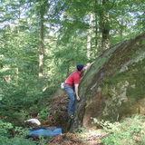 A few small blocks further east from the quarry is spread in the woods with less good stone quality.