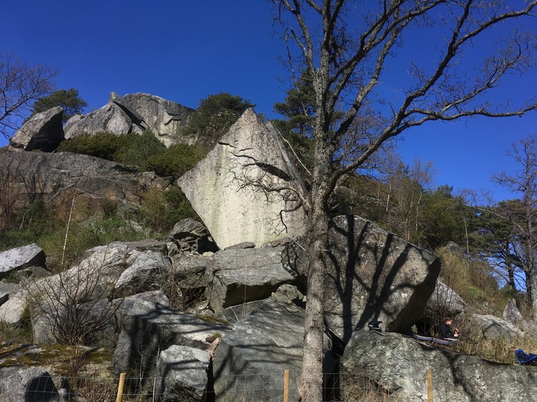 Østerøya is an area with a lot of potential for both bouldering and trad climbing! But the area is a mix between public area and private areas, so please do not jump fences, like the one around Kjerkeglovblokken. To get to that area, please walk the west side of the ridge without jumping fences or opening the gates to the animals.