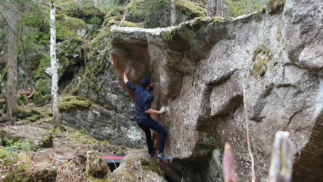 ⭐ Sector Haraparken might be the best area for complete beginners to try outdoor bouldering in Østmarka. The area consists of many, low rocks with good landings, the approach is short, and almost all problems are low grade. A bit further into the woods you find the Nyresteinene sector, which consists of two boulders with many good quality lines on them. In the north-eastern part you'll find Bukkesteinen and Pas de-steinen, which offer few but nice routes on various grades. These two boulders are located in a fairly humid area, so it takes a while to dry out after wet weather.