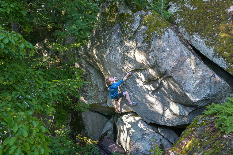 🧗♂️ Panshamn is a newly developed area with tons of boulders located nicely in the open forest and along the calm lake. What makes the climbs here stand out are—except for the great rock quality—the varied formations which create tricky and interesting problems to solve! The whole of Panshamn is quite large, but you rarely have to walk far thanks to the shear amount of rock throughout the area. There's even a painted circuit which tie the blocs together with 76 easy yet enjoyable climbs (more on that below). The lakeside rocks dry quickly which is nice on damp days, whilst some of the stones further into the forest can seep for a while. Most of the lines are of moderate difficulty (circa up to 6C), although having said that the gradings in the south and around these parts in particular can be kinda stiff – so keep that in mind. You have to walk a few hundred meters along the main path to the first blocs and then some more to the farthest sectors — and even though there's scarcely any trails among the stones, the terrain is open and easy to pass through.