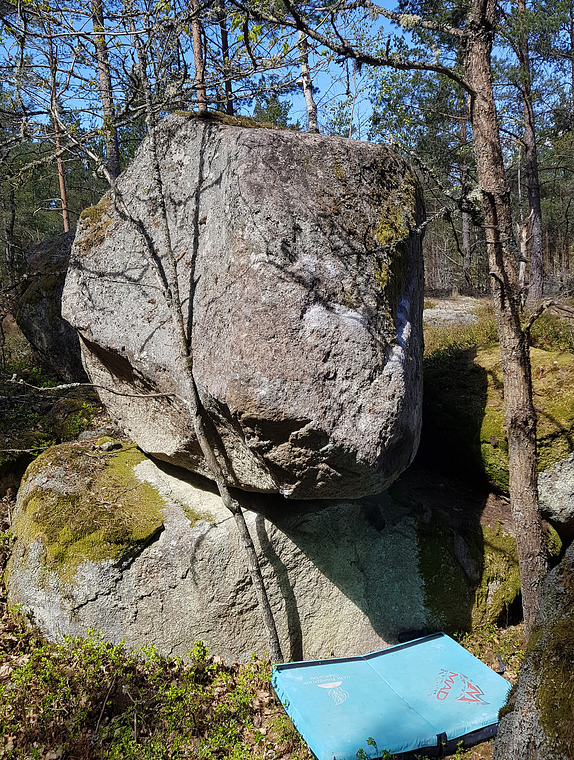 Left hand to upper stone ("sidepull"). Lock right foot between the stones. Right hand up to the big crimp. Then match with left hand or straight up to higher holds. Continue up via the big holds use high feet placement to reach for the top.