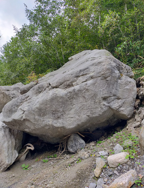 A traversing line on a gently overhung bloc; the riverwashed limestone offers very few, small and slopey footholds that make the slopey crimps quite hard to move around on. It requires a lot of precision to hit the few bits of very textured, almost spiky, rock that makes this line doable and failure to find them leads to an inevitable fall. After a couple of moves you can reach 2 little jugs and exit there, but this line doesn't use those 2 holds and stays low all the way to the topout.