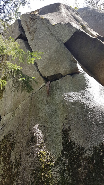 Climb the other side of the pinnacle. Starts with a jump to the horizontal ledge. The big stone in the middle is ok for protection.