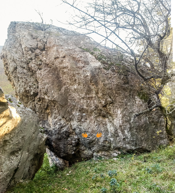 parte “molto”sit da sotto il masso con fessura verticale mano dx e sx su prese poco nette, sequenza di movimenti compressi, esce alto come Giskard
