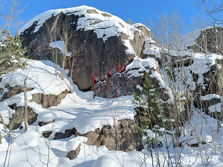 Saved from the original drawn topo. Graded Finnish/Font 2. Landing is iffy, but it looks like you won't fall on this one.