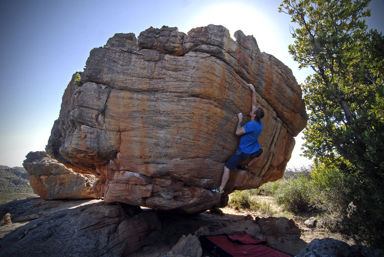When in 2005, Flo Grimus, Tom Bartl & I came to the north of South Africa, the original plan was a trip through Namibia to try and find some great bouldering. Sure, as a backup I always had the Cederberg mountains in mind, from 1998 when I was there for 3 weeks during March and April. After some great exploring in Namibia but also tiring car driving we decided to switch plans and head towards Rocklands. We spent a day or two in the classic areas, the developed spots, and it didn't take us long to realise how amazing and how much of outstanding rock is home to this mountain range. The weather wasn't great and there were quite a lot of rainy days. But down in this valley it seemed to have less rain and different rocks. While the classic areas had a lot of sit-start problems with focus on finger power, in the valley everything seemed to be taller with less holds. Purer lines demanding all around body climbing. In my old days this was what I always searched for. We could not believe how much fun it was spending time out here. Sometimes I climbed for 5 or 6 days in a row, already tired from the days before but too stoked to rest and not be able to climb on the still so many king lines to open. On the few days we didn't climb we hiked around a lot, to seek and spot out new stuff. I can say for all 3 of us it was one of the most amazing times ever, bouldering.