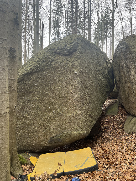 feet start on obvious ledge 40cm off the ground. weird topout. crumbly