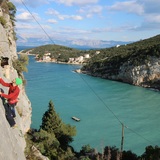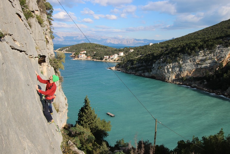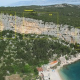Island of Hvar is one of the most beautiful and sunniest islands of the Croatian coast, with the typical Mediterranean climate. Here you can find a number of coves surrounded with crags appropriate for climbing. Some of them are already equipped for climbing, and the crag in the cove Pokrivenik is a newborn climbing site. It is a small, beautiful cove completely surrounded by cliffs built of a superb quality rock. Routes that are bolted are just the beginning; the potential for new routes is huge. The cliff face offers experience in vertical slabs with small sharp holds and in overhangs with tufas. There is enough space for hard routes – not yet utilized. Due to a diverse orientation of walls, the crag is appropriate for climbing in all seasons. Even in hot summer days, early in morning and later afternoon, with a touch of a breeze, climbing here may be a pleasant experience. An additional summer-time benefit is a beautiful beach beneath the crag. There is a small family camp and a tavern in the vicinity. Would you need anything more?