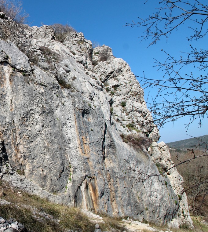 15m. Bouldering start. Climbing 1m left of the first bolt makes it 6a.
