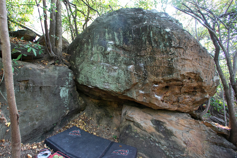Semi sit start, both hands on the edge of an overhang with the feet under the roof to the left and right on friction without using the lower boulder to the right. From here you reach with the right hand to a small crimp, and with the left handto a vertical crimp, then lift your right foot above the roof and reach with your right hand to another small horizontal crimp and left hand on the vertical ladge, from there climb up to the left , exit straight up