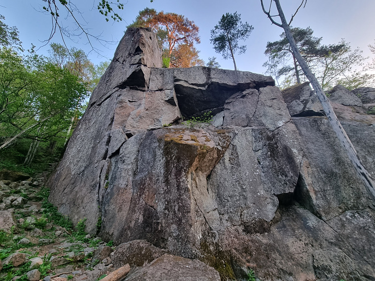 Följ den tydliga tunna sprickan från vänster om nischen till upp genom taket. Sprickan fortsätter även in på svat.