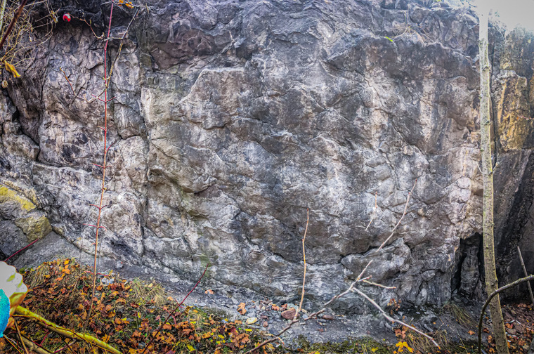Zhruba uprostře dlouhé stěnky mezi plotnami ze stoje z poklopené police převisem do rajbasu a dále na výlezový palouček