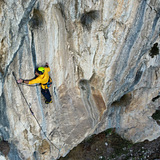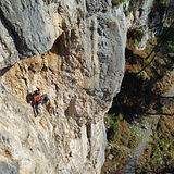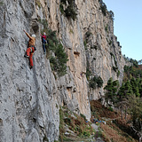 The rock is compact limestone, solid and occasionally sharp, typical of southern Italian crags. Climbing is mostly technical and vertical, requiring balance, precision, and good route-reading skills. There are also more physical sections with overhangs and bouldery moves on sharp holds.