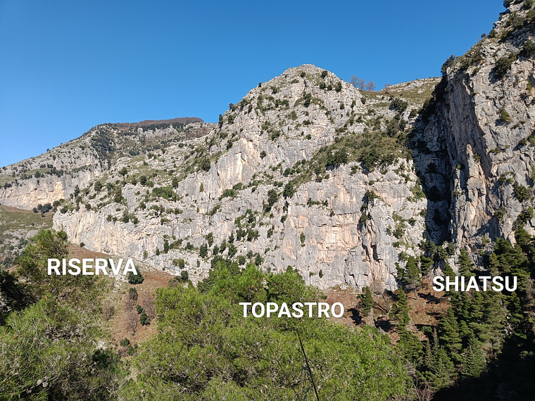Il settore è suddiviso in tre diverse pareti — “Shiatsu”, “Topastro” e “Riserva” — e conta oltre 80 vie sportive, di lunghezza variabile tra i 15 e i 30 metri. Le difficoltà spaziano dal 5b all’8a, rendendo la falesia adatta a un’ampia gamma di arrampicatori, dai principianti agli esperti.