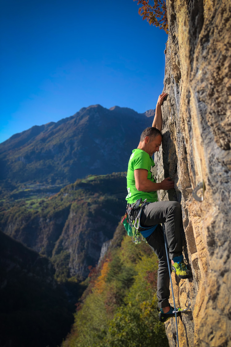 Let's dive into the first sector, Il Vaticano, an imponent wall standing above a ledge that offers a captivating vista of the Limarò gorge. Routes are definitely a challenge, with nearly all of them surpassing the 7a difficulty. Climbing is characterized by physicality, featuring long endurance routes on an overhanging wall. While the equipment is reliable and the ledge is large, caution is advised for children due to the exposed approach. Il Vaticano truly shines on sunny winter days.