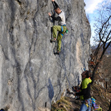 Arrampicata tecnica su placche verticali e leggermente appoggiate di calcare grigio compatto, con prese di vario tipo.