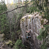 Hittades när Joakim lekt med länsstyrelsens topografikartor och lurade ut Joar i skogen för att leta efter ett stort block som visade sig vara en damm. Besviken cyklade han ner för blåbergabacken men fick då skönja något som gömde sig inne i skogen. Ravinen upptäcktes och dagen var räddad. Att få till att bulta den visade sig dröja några år men när tummen var ur var det snabbt gjort, mycket för att klippan just om man mäter i meter inte är så stor.