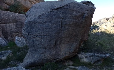 Park as any Pass crag to the parking. Walk for 1.2km on the sandy road and take left turn where you see cairns on the left. You'll see Rhino from the sand road. Follow the path for 400 meters an you'll arrive to the classic Rhino feature.