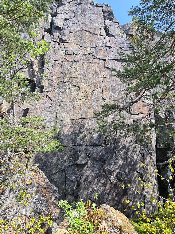 Starta från blocket i skrevan. Borrbultar i starten förhindrar fall ner i skrevan. Klättra med en dragning åt vänster upp mot spricklinjen. Undvik smulig klippa (efter hålformationen) genom att klättra ute på väggen till vänster i slutet av leden. Retrosopa och kompletteringsbultad 2025. Firningsankare.