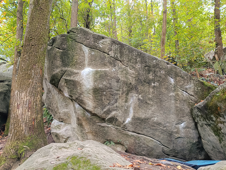 Parte sulla parte dx del masso, poi segue il bordo su svasi e buchi