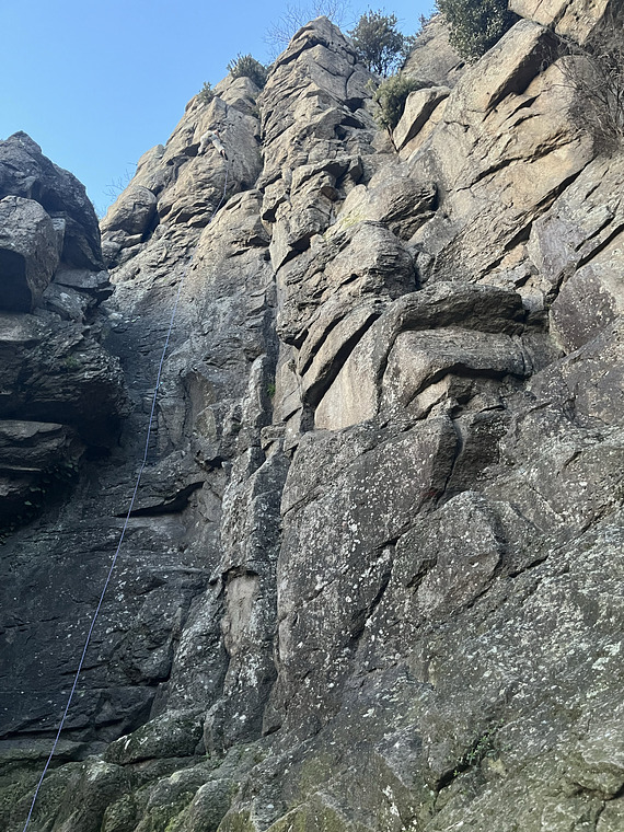 Penultimo spit nel bel mezzo di un passaggio un po’ delicato, pochi metri sopra un balconcino: occhio ai voli.