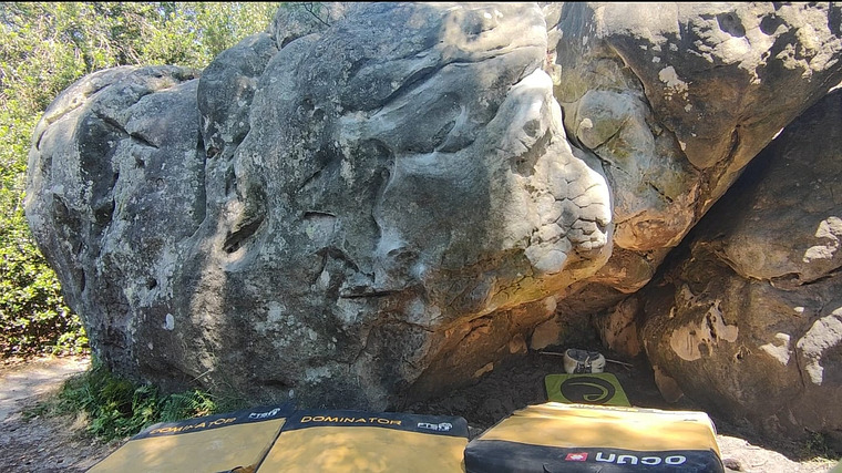 Sitstart back in the cave (like Sixieme piste), traverse low and exit in the first face.