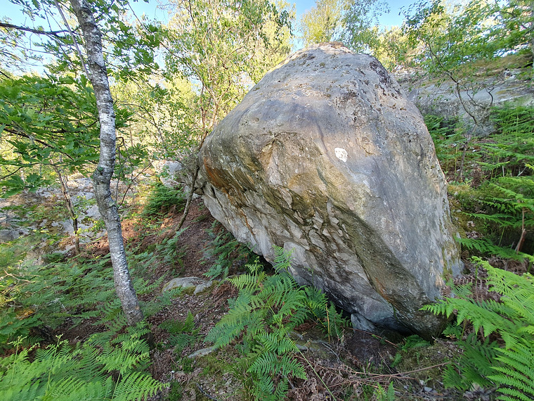 Sit start at arete, topout just before the boulder at first big pocket