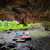 A big cave located hidden down at the water. A lot of roof boulders at the lip of the cave, where kneebars, heel-toe cams and a lot of core strength come in handy. Sportclimbers can indulge themselves too in one of the 7's or 8's. You won't find a lot of 'easy' climbing here. So guns out!