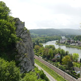 Most climbers will arrive in Namur using the Highway E411 from Brussels to Luxembourg. The easiest is to take exit 14 (Namur Sud) and drive down to the city of Namur. At the entrance of Namur (Porte du Luxembourg - traffic lights after the tunnel of railway), turn left and 500 m further at the roundabout turn left to cross the river Meuse (Pont des Ardennes), at the next roundabout, turn right and continue straight direction Yvoir on the RN 947, you will cross another main crossroads with traffic lights then a railway crossing and when you pass the last houses of the suburb Jambes, you will see on your left a parking just in front of the cliffs.
