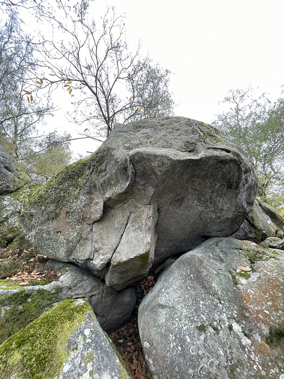 Loop traverse. Sitstart between the blocks and make your way up to the lip. Traverse right halfway around the boulder and go down. Make a loop climbing up and back left again and exit left of a small blue line
