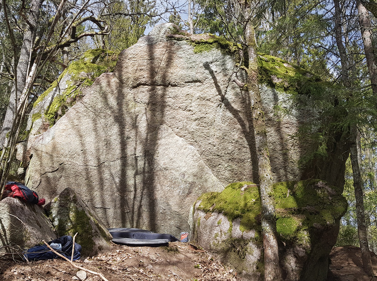 6A/+? Kändes finast linjemässigt att toppa när man nådde kanten men ett alternativ är att toppa på stenens högsta punkt. Gjorde båda varianterna och tyckte inte att det påverkade graden.