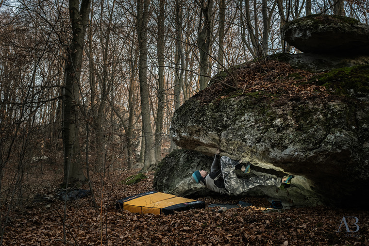 Niski start głęboko w grotce z ewidentnych chwytów, dachem bez chwytów za prawą krawędzią.