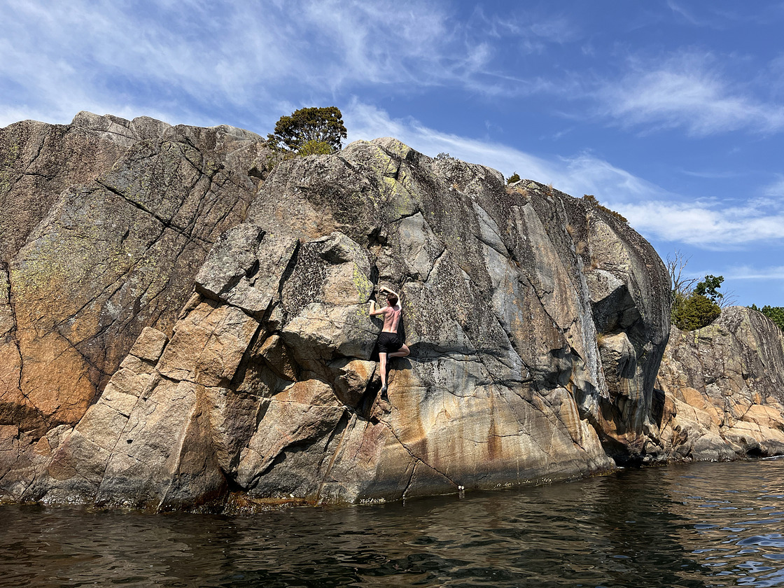Klippen er et hoppested men først pusset og klatret juli 2023. Øya Saueholmen er en kjent ferieøy med teltplasser på gressenger. Det er gjerne satt ut sauer her. Øya har utedo, og det er faktisk drikkevann i ett par kraner. Det er lett og parkere på Engø båthavn der Veierland fergen går fra. Enklest er sup til øya. Ca 500 m.