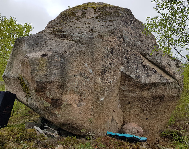 Start with left foot on edge to the left, right foot on structure close to the stone, right hand on large hold and left on smaller hold above it. Move left hand up to crimp. Move right foot up and then reach for the edge with the right hand. Traverse left via edges and crack and top out.