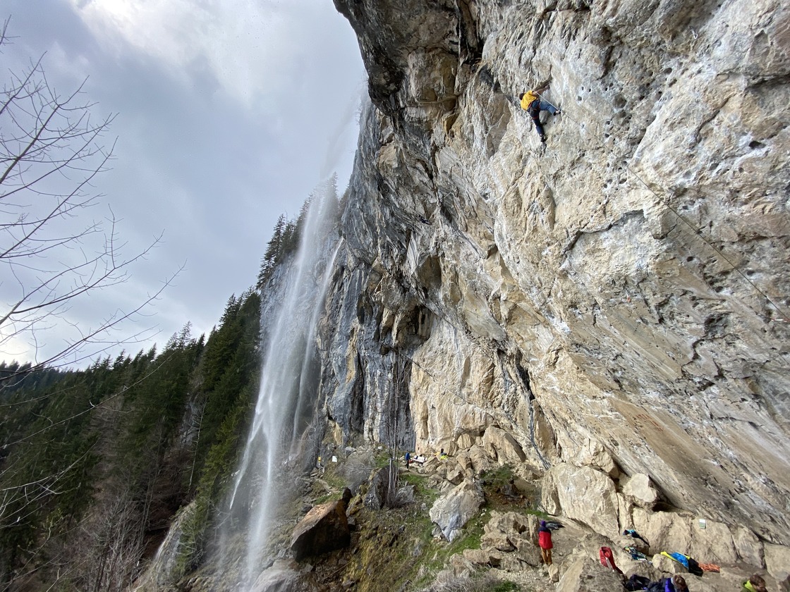 EN 🇬🇧: The Schleierwasserfall near St. Johann in Tyrol is one of the most spectacular climbing areas in the Alps. This impressive 60-meter-high waterfall lies at the base of the Wilder Kaiser mountain range and offers a unique climbing experience in a breathtaking alpine setting. With over 200 routes on steep, south-facing limestone, the crag caters to advanced and elite climbers, featuring difficulties ranging from UIAA grade 5 up to 11. Iconic lines like “Open Air” (9a+), first climbed by Alexander Huber, and “Mongo” (9a) attract top climbers from around the world.