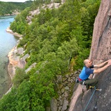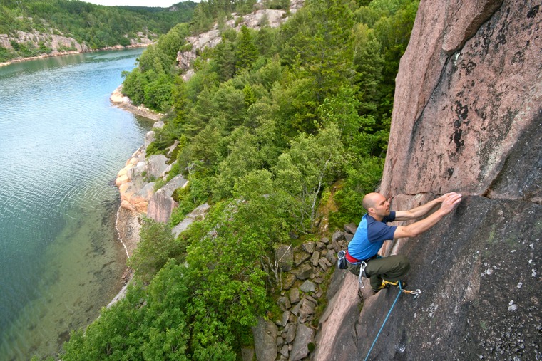 Forty meters high and west-facing crag with shade until noon. Excellent quality routes on compact granite and nice beach with swimming opportunities.