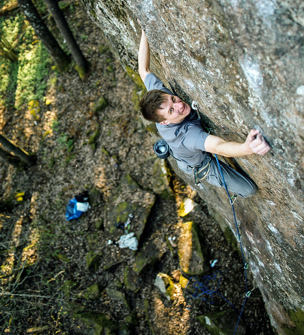 The crag is south facing. Fairly sunny and open at the left part of the wall (warm in springtime), but more in the shade on the right side. The crag dries fairly quickly, but slower on the right side. Nice view from the top.