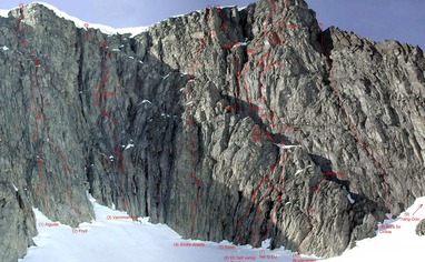 Veggen er ca 200 meter høy, og det som er litt spesielt er breen som ligger under. Dette gjør at første taulengde på rutene er veldig rene. Alle rutene er godt sikret.