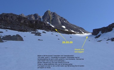 Anmarsj: Kartblad 1420 I Snota Det letteste er å gå om Vinddøldalen som er i Surnadal. Fra Skei kjører du ca 10 km i retning Trondheim. Ta til høyre opp Vinddøldalen, her er det bomvei. Etter ca 8 km. er det en ny bom. For å komme videre med bil må du ha nøkkel til bommen. Denne er det ikke så lett og få tak i, da det bare er et begrenset antall. pga. naturvernområde. Har du nøkkel kan du kjøre til den innerste parkeringsplassen, har du ikke nøkkel er det en fordel å bruke sykkel. Sykkel kan være kjekt uansett man sparer litt tid. Følg veien / stien opp til Vassdalsvatnet, gå langs vannet til enden. Deretter går du opp lia mot Snota. Fra enden av vannet går du rett Sør-Øst mot skaret, til venstre for en nabbe som du ser oppe i lia. Teltplassen er opp og til venstre for denne nabben. Gå opp skaret (her ligger det snø hele sommeren). Fortsett på flata rundt steinura til du kommer under breen. Nå ser du Sørveggen på Snota. Da er det bare å løpe opp breen til innsteget til den ruta du skal klatre. Når du er oppe - husk å skrive i boka som er på varden. Gangtid er ca 4-5 timer.