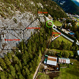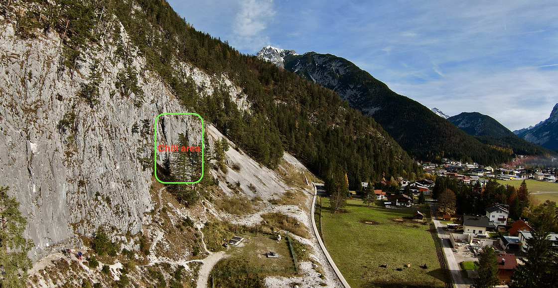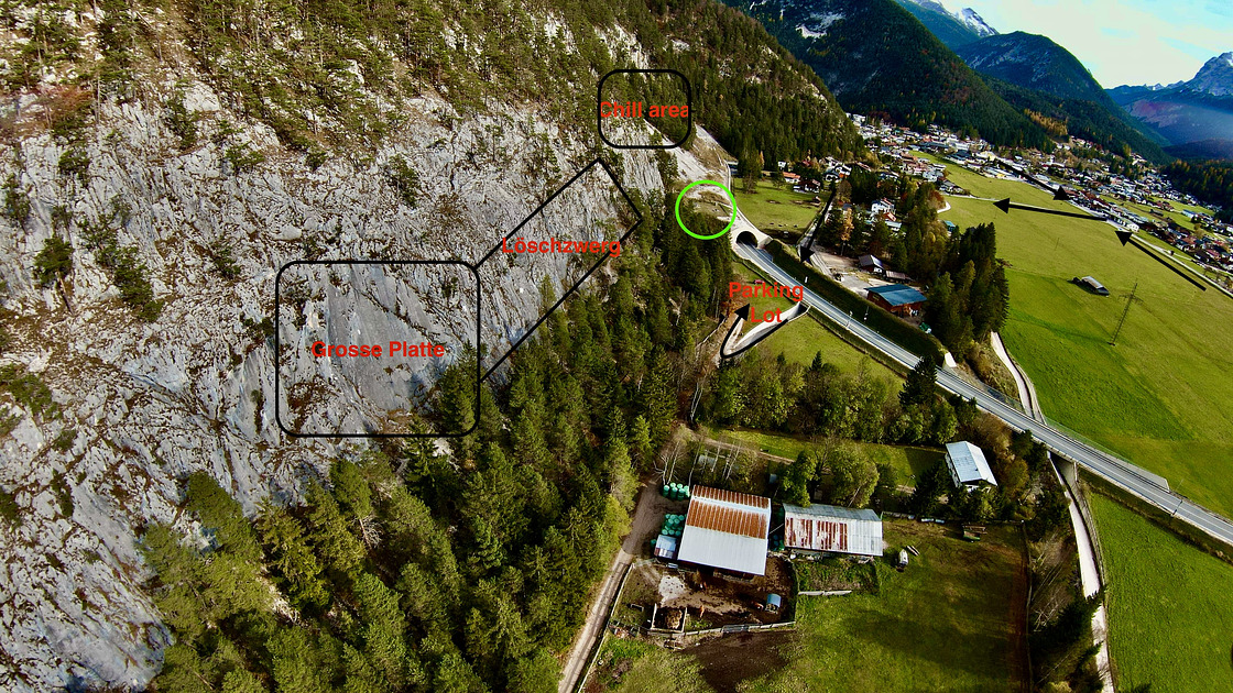 Family friendly limestone crag with easier to moderatly difficult and mostly slabby routes. It is one of the best developed crags of Tyrol, with bathrooms, a fountain with running drinking water (stone at chill area), a slackline and a few really nice benches. This Recreational area is found to the right of Löschzwerg about 1 minute walking form the parking lot.