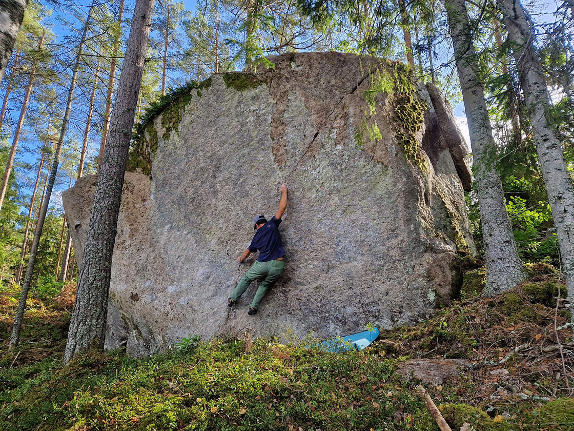 Starbäcksmåla is a small crag with a main 5 meter high granite boulder that have a couple of really nice problems ranging from ~6A to 7A+ difficulty.